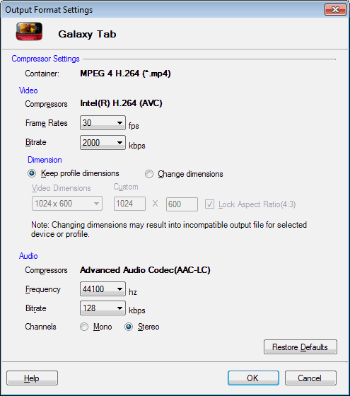 This is an example of Samsung Galaxy Tab video device profile.