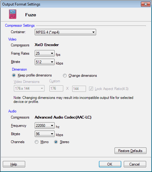 The files encoded with XviD Encoder are compatible with almost all the players. The frame rate is set to 30 Fps and bitrate is 900 Kbps. You can choose to preserve or change the video dimensions.
