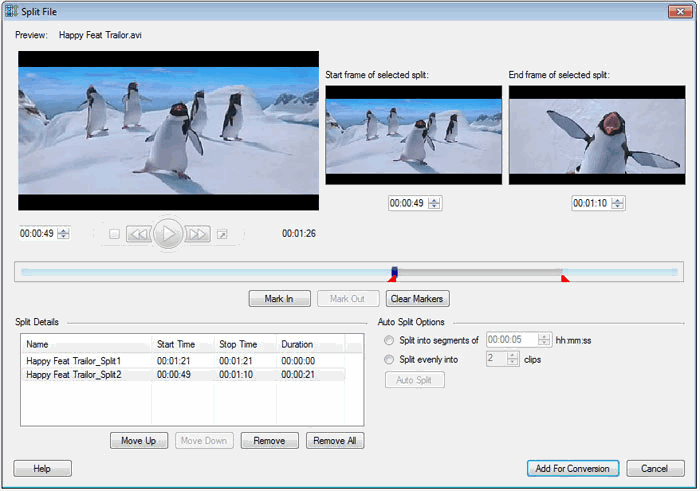 Suppose you have split a video and added the part for conversion. You have an option to modify the duration of a split that you have already added in the conversion list. Select the part of the video from the conversion list, and click Tools >> Split File. The markers are already placed at the positions you had previously set. You can move these markers to modify the duration. Once you have set the final positions, click Add For Conversion.