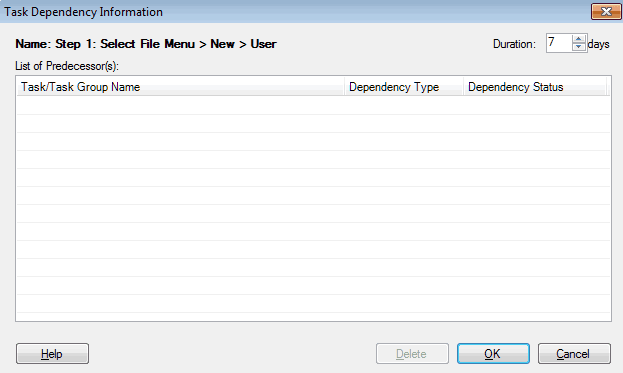 Select a task from the Task List and click on Edit >> Dependency.