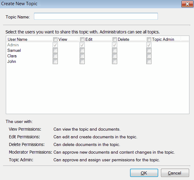 In the New Topic dialog that is displayed you can name the topic, select the users with whom you want to share and assign specific topic permissions to them.