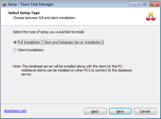 The Full Installation of Team Task Manager will install the Database Server and the Client software. This PC will be recognized as a server PC that stores all the important data. Using the Client software the PCs in your network can connect to the Database Server.