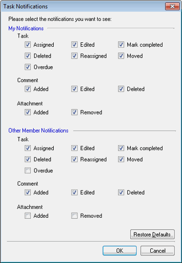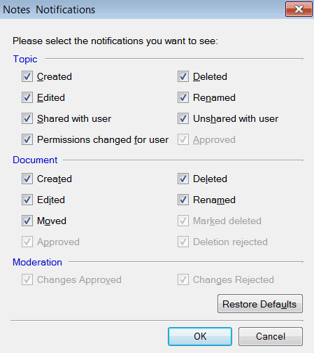 When Show Notes Notifications is selected, Team Task Manager notifies you if topics or documents that you have specified have changed. For example, if you select Document >> Edited, whenever a document that is shared with you is edited, you will be notified about the change.