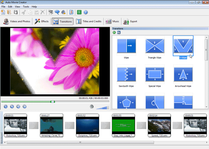 Combinez les médias de toute source pour créer vos films. Vous pouvez utiliser la vidéo, l'audio et des fichiers d'image, ou à la capture audio et vidéo directement à partir d'un appareil photo numérique ou webcam. Auto Movie Creator peut transformer une collection de photos numériques en diaporama haute qualité avec seulement quelques clics. Ajouter une musique de fond, la voix sur la narration, et les transitions de diapositives professionnel et vous avez un spectacle impressionnant film diapositive.