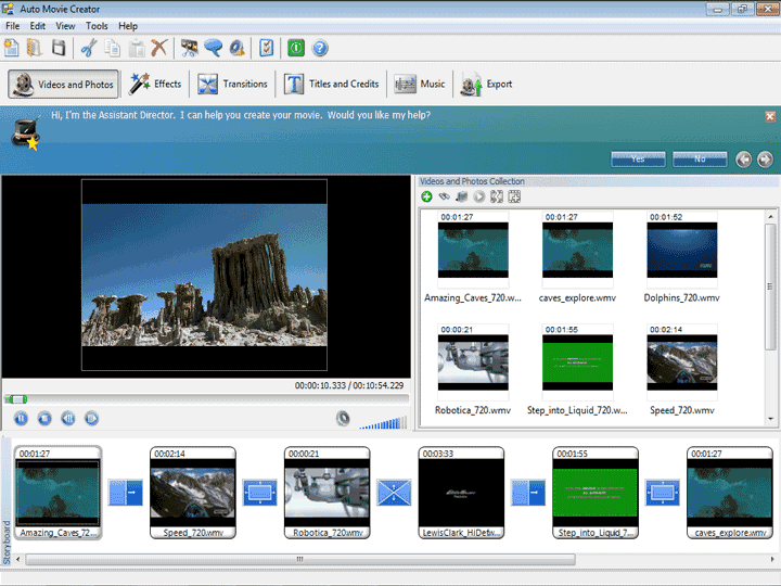 Avec l'assistant intégré directeur adjoint, vous n'avez pas besoin de passer du temps à apprendre à utiliser le programme-on vous conseille à chaque étape de la manière que vous faites votre chef-d'œuvre. Autre gain de temps est automatisé de détection de scène. Au lieu de soin en regardant à travers toutes vos séquences vidéo et se divisant en scènes à éditer, il suffit de sélectionner Détecter Scènes et laisser Auto Movie Creator fait tout ce travail pour vous.