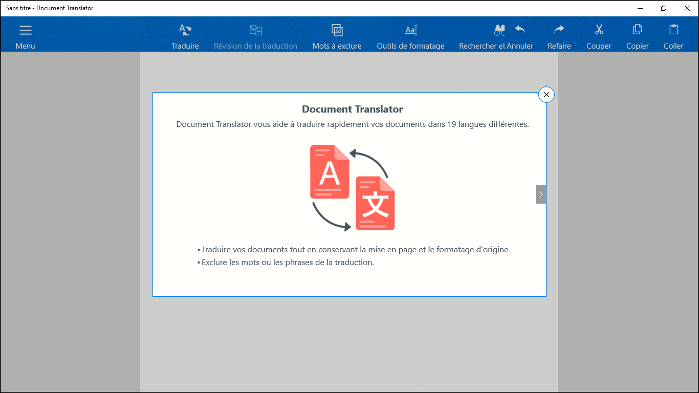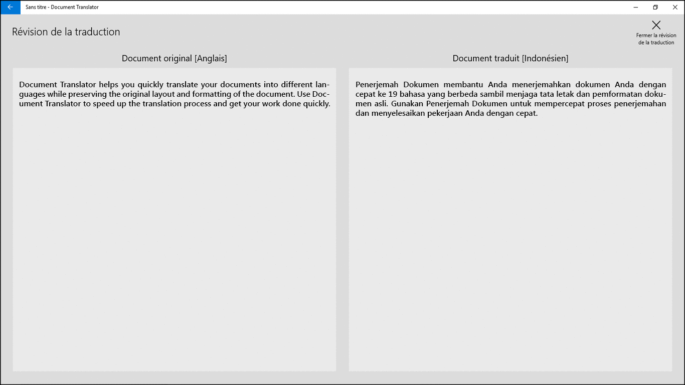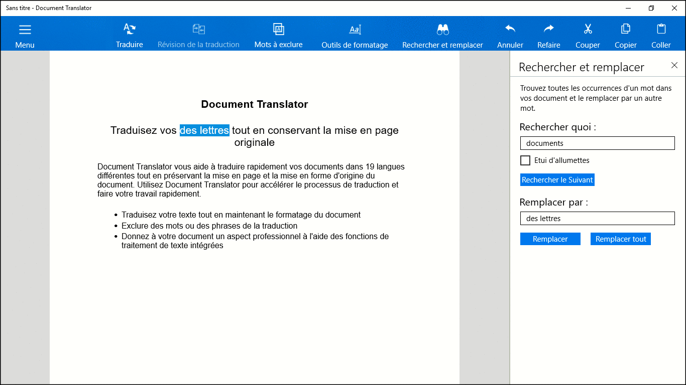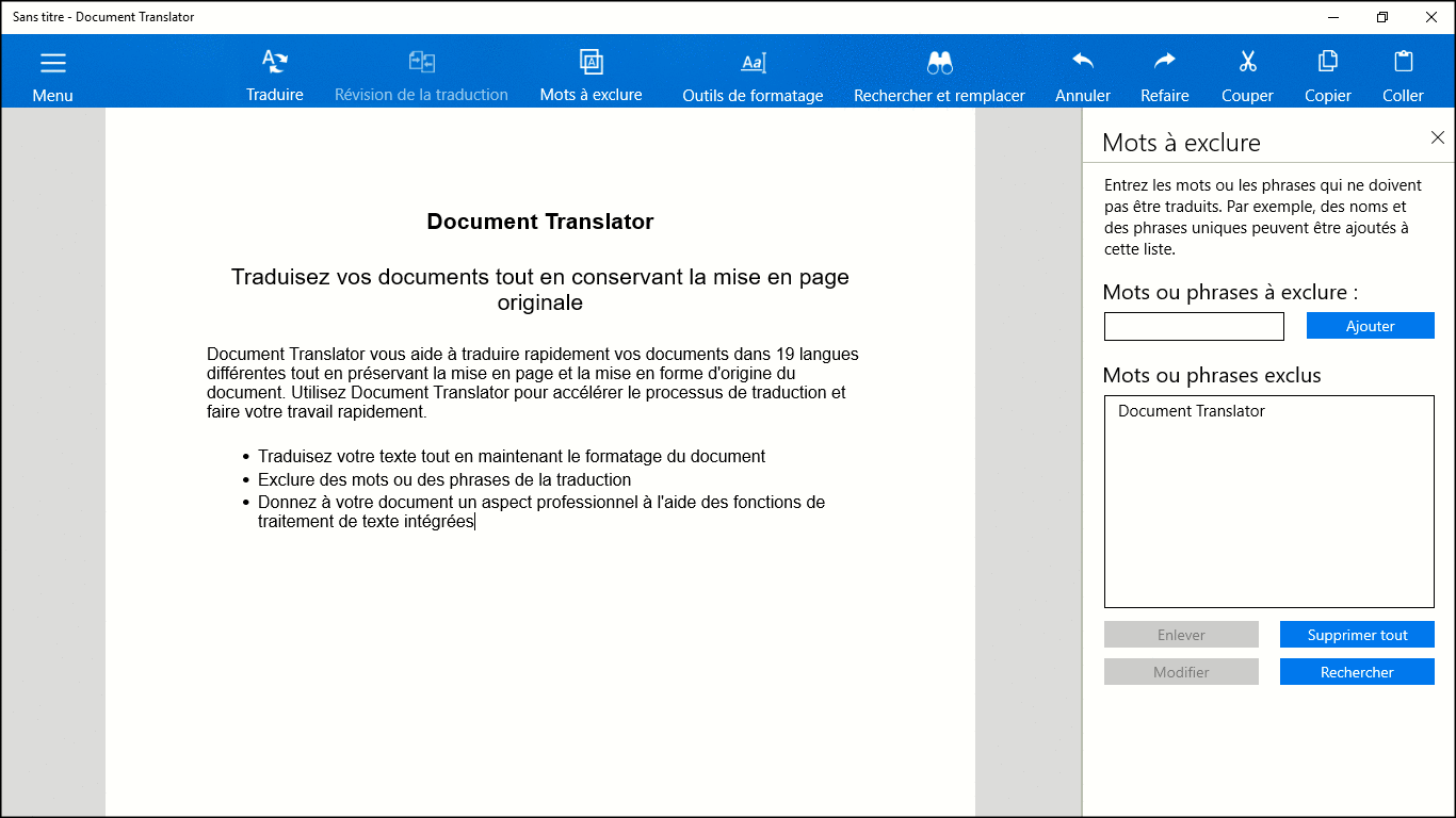 Choisissez simplement un document, sélectionnez la langue et laissez le Document Translator De plus, vous pouvez exclure plusieurs mots ou expressions de la traduction. Cette application vous permet d’empêcher la traduction de certains mots ou expressions tels que les noms de lieux, de produits et de personnes. Il suffit d’ajouter le mot à la liste et le Document Translator Traduire vos documents n'a jamais été aussi rapide et facile.