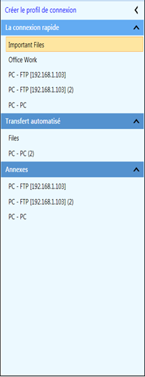 Le panneau Profil de connexion répertorie tous les profils ajoutés à l'application. Il est composé des sections Profil suivantes: Connexion rapide, Transfert automatisé et Horaires. Vous pouvez personnaliser le panneau Profil de connexion en réduisant ou en réajustant la taille du panneau en conséquence.