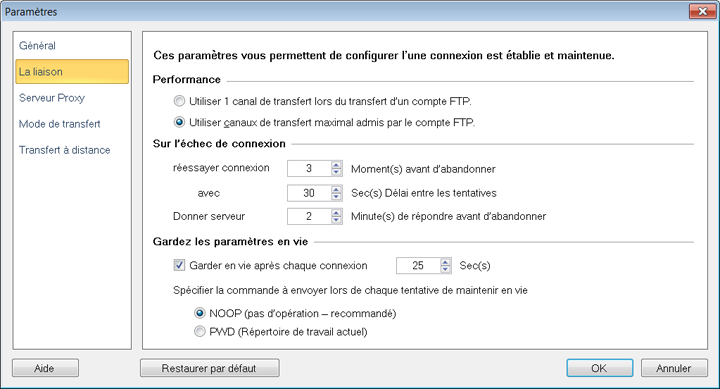 Gardez la connexion en vie après chaque x sec (S) De nombreux serveurs FTP se déconnectent automatiquement si aucune commande n'est envoyée trop longtemps. La fonction Keep Alive empêche la déconnexion en envoyant des commandes (qui ne font rien) régulièrement. Pour permettre de rester en vie, vous pouvez cocher l'option Activer la conservation. Spécifiez l'intervalle keep alive avec l'option Keep Alive interval x sec (s).