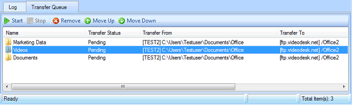 La file d'attente de transfert a sa propre barre d'outils. Après l'ajout de fichiers à la file d'attente, démarrez le transfert en cliquant sur le Démarrez bouton sur la barre d'outils de la fenêtre de la file d'attente de transfert. Avant de commencer le transfert, vous pouvez supprimer les fichiers de la file d'attente ou de glisser plus les fichiers depuis le gestionnaire de fichiers. Vous pouvez définir l'ordre dans lequel les fichiers vont être transférés avec la Monter et Descendre boutons.