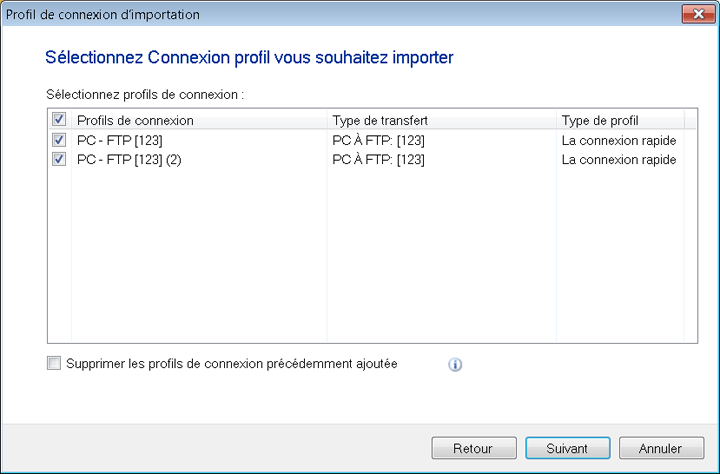 Par défaut, tous les profils de connexion sont vérifiés. Vous pouvez choisir les profils que vous souhaitez exclure en les désélectionnant. Pour ajouter ces profils de connexion à tous vos profils existants, décochez la case Supprimer les profils de connexion précédemment ajoutés option.