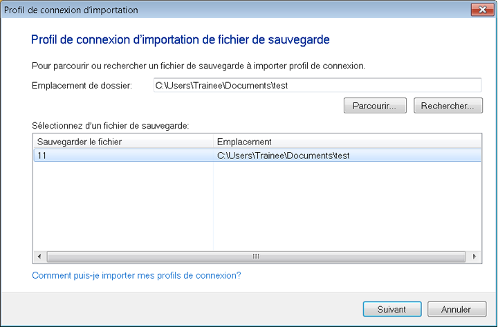 Dans la boîte de dialogue Importer le profil de connexion, vous devez spécifier l'emplacement du dossier de sauvegarde. Après avoir spécifié le dossier, vous verrez une liste de fichiers de sauvegarde dedans. Sélectionnez un fichier et cliquez sur Prochain.