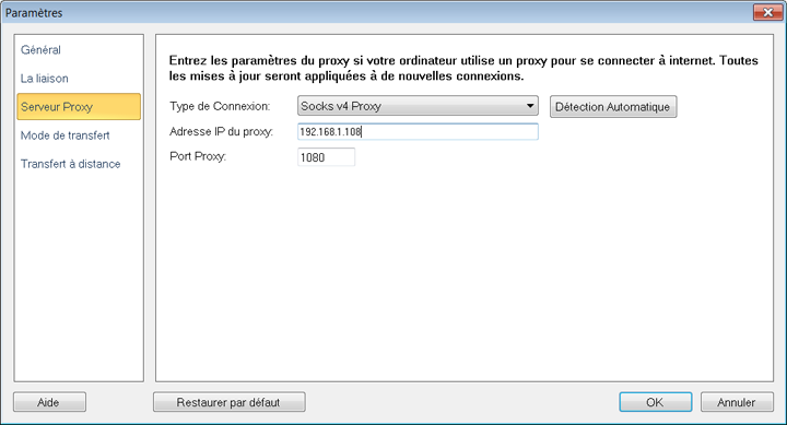 Un serveur proxy vous permet de vous connecter au serveur cible en l'utilisant comme couche intermédiaire. Il transmet vos demandes au serveur cible et vous renvoie la réponse.  Auto FTP Manager vous permet de vous connecter via les proxy proxy 4 & 5, HTTP ou FTP. Si vous êtes derrière un serveur proxy, configurez ces paramètres dans l'application, afin de vous connecter à votre serveur FTP.