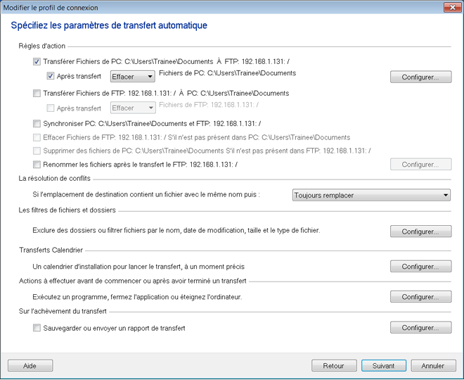 Une fois le profil automatisé exécuté, vous pouvez définir Auto FTP Manager pour effectuer les opérations suivantes: