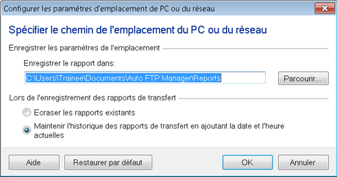 Par défaut, les rapports de transfert seront sauvegardés sur votre PC dans Documents >> Auto FTP Manager >> Transférer des rapports. Vous avez la possibilité de changer le dossier par défaut en cliquant sur Feuilleter.
