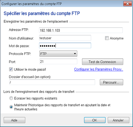 Un emplacement distant est toujours l'option la plus sûre pour enregistrer les données importantes. Votre rapport de transfert peut être sauvegardé sur un serveur FTP. Il vous suffit de spécifier vos détails de connexion FTP et votre rapport de transfert est protégé. Les détails de connexion FTP incluent le nom du serveur ou l'adresse FTP, le nom d'utilisateur, le mot de passe, le numéro de port et le dossier de destination sur le serveur.