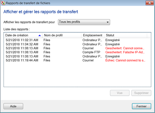 Remarque: Tous les rapports de transfert précédemment enregistrés dans le dossier Local ou Réseau, le compte FTP et le compte de messagerie seront listés dans le Rapports de transfert de fichiers dialogue.