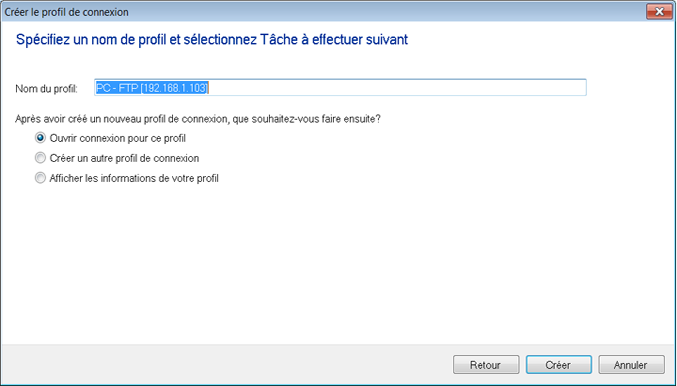 Vous devriez commencer par créer un Profil pour chaque serveur FTP avec lequel vous travaillerez. Un profil contient les informations nécessaires pour se connecter au serveur.