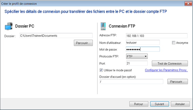 Nom d'utilisateur et mot de passe: Entrez le nom d'utilisateur et le mot de passe pour vous connecter à votre serveur FTP.