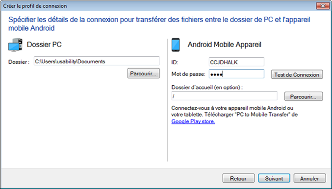 2. Si vous transférez des fichiers entre un PC dossier et Mobile périphérique, vous devez fournir le chemin du dossier et les détails de connexion Mobile comme indiqué ci-dessous: