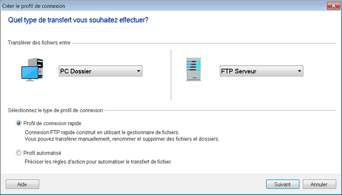 Choisissez le type de profil de connexion en tant que profil de connexion rapide ou profil automatisé. Profil de connexion rapide vous permet d'utiliser le Gestionnaire de fichiers pour transférer manuellement des fichiers entre des dossiers en utilisant File de transfert. La fenêtre Gestionnaire de fichiers est divisée en deux panneaux, chacun affichant une interface de style explorateur. Les fichiers peuvent être déplacés d'un panneau à l'autre et transférés à d'autres pour faciliter le transfert. Profil automatisé est utilisé pour transférer automatiquement les fichiers entre le dossier sélectionné. Par exemple, si vous souhaitez transférer automatiquement des fichiers entre un dossier PC et un serveur FTP, vous devez configurer règles automatisées après avoir fourni le chemin du dossier et les détails de la connexion FTP. Les exemples ci-dessous vous aideront à configurer les profils de connexion PC à FTP, PC à Mobile et PC à PC distant.