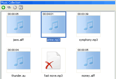 Vous pouvez trier la liste des pièces justificatives en mode Détails en cliquant sur un des titres des colonne: Nom, Type, Et Durée . La barre d'outils de la Collection de musique se compose de quatre boutons. Le Ajouter de la musique bouton vous permet de parcourir les fichiers musicaux et les ajouter à la collection. Le Recherche de fichiers médias bouton détecte tous les fichiers audio dans un dossier sélectionné et les ajoute à la collection. Cliquez sur le Aperçu bouton pour lire le fichier sélectionné la Aperçu article de l'espace de travail. Ajouter au Clip place un fichier de musique sur la cellule sélectionnée (la cellule clip avec une bordure foncée autour de ses bords) ou de la cellule active (cellule avec une ligne en pointillés autour d'elle).