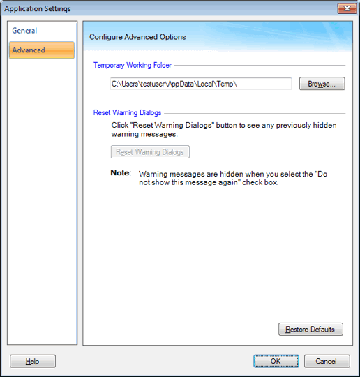 Il existe différents dialogues d'aide qui apparaissent lors de l'utilisation de l'application. Ces boîtes de dialogue peut être désactivée en sélectionnant le Ne pas afficher le message case à cocher. Si vous voulez lire ces messages, cliquez sur la Réinitialiser Messages bouton