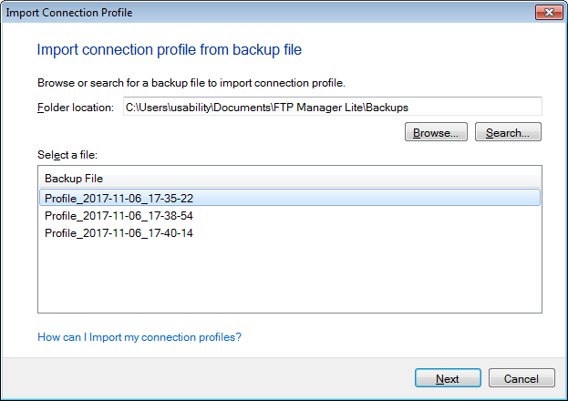 Dans la boîte de dialogue Importer le profil de connexion, vous devez spécifier l'emplacement du dossier de sauvegarde. Après avoir spécifié le dossier, vous verrez une liste de fichiers de sauvegarde dedans. Sélectionnez un fichier et cliquez sur Suivant.