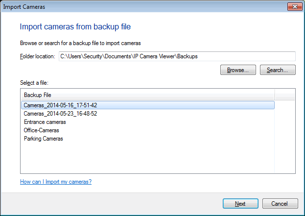 Vous pouvez importer les paramètres de l'appareil à partir de la version antérieure de IP Camera Viewer. Pour restaurer l'appareil photo (s) à partir d'un fichier de sauvegarde, cliquez sur Fichier >> Appareils d'importation.
