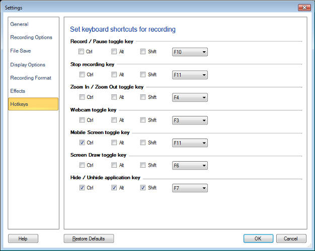Vous pouvez modifier les raccourcis clavier par défaut en sélectionnant différentes touches de fonction dans la liste déroulante.Vous avez la possibilité de choisir soit Ctrl, Alt ou Décalage touche avec la touche de fonction sélectionnée. Par exemple, vous pouvez utiliser Ctrl + F4 à la place du F3 touche de raccourci vers ajouter ou gérer une webcam de votre écran.