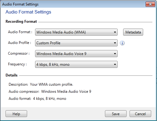 - Format: Plus les paramètres de format audio sont élevés, meilleure est la qualité audio.Généralement, lorsque vous utilisez le Voix compresseur, la voix enregistrée est compréhensible à des paramètres aussi bas que 5 kbps et peut sonner bien à 12 kbps.Pour enregistrer en utilisant le Windows Media Audio 9.2 compresseur, vous devez régler au moins 24 kbps, et pour enregistrer de la musique, 48 kbps.Vous pouvez expérimenter pour déterminer la valeur la plus faible qui produit une qualité acceptable.
