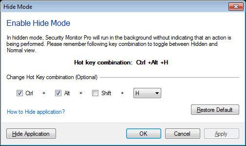 Pour masquer ou afficher l’application, vous devez définir et mémoriser la combinaison de touches de raccourci.Par défaut, Ctrl + Alt + H est défini comme touche de raccourci.Si vous modifiez la valeur par défaut, sélectionnez une combinaison de touches de raccourci pouvant être facilement mémorisée.Sélectionnez une combinaison de touches et cliquez sur le bouton Appliquer bouton.