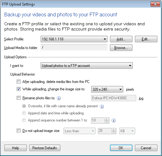 Pour configurer le comportement de téléchargement FTP, cliquez sur Ajouter un appareil photo >> Actions >> Télécharger des fichiers multimédias.