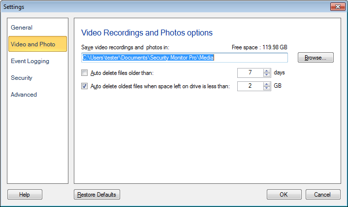 Enregistrer des photos et des enregistrements vidéo dans: Par défaut, tous les fichiers multimédias tels que les enregistrements vidéo et les photos seront enregistrés sur votre PC dans Les documents >> Security Monitor Pro >> Média. Vous avez la possibilité de changer le dossier par défaut en cliquant sur Feuilleter.