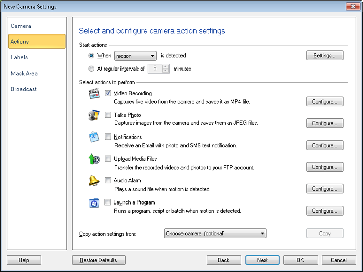Copier les paramètres d'actions à partir de: À l'aide de cette fonctionnalité, vous pouvez copier les mêmes règles d'action que celles que vous avez enregistrées pour d'autres caméras.Cette option apparaîtra si vous avez au moins une caméra ajoutée dans l'application.Cette option est pratique lorsque vous souhaitez ajouter rapidement les mêmes actions que celles configurées pour une autre caméra.