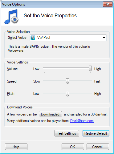 Pour changer la vitesse, la hauteur et le volume, cliquez sur Outils >> Voix.