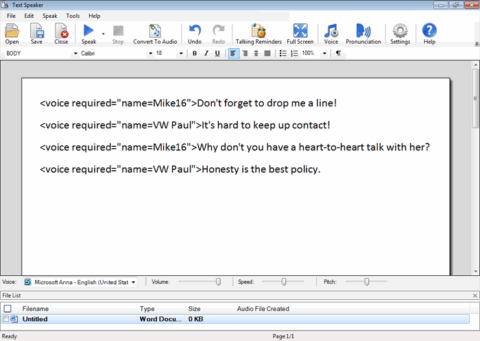 Parfois, vous aurez peut-être besoin que votre document soit lu par plusieurs voix. Par exemple, vous voudrez peut-être qu'une voix masculine lise une partie du document et qu'une voix féminine lise une autre partie. Dans ce cas, vous pouvez insérer une nouvelle voix à n'importe quel point du document en utilisant une marque vocale spéciale. Text Speaker passera à l'autre voix dès qu'elle atteindra cette étiquette.