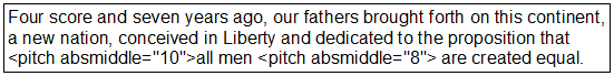 Le texte est maintenant entouré par <pitch absmiddle = " N " > et <pitch absmiddle =" M " > tags. Où, N représente le changement de hauteur sélectionné par l'utilisateur en utilisant Insérer un pas dialogue et M représente la valeur de hauteur précédemment sélectionnée par l'utilisateur sur Barre de voix