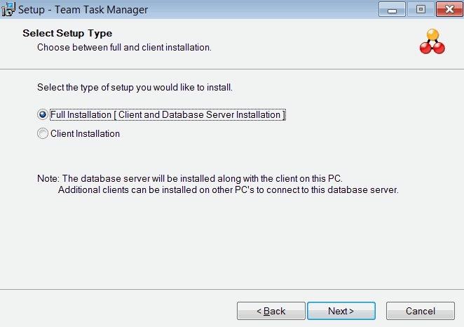 L'installation complète de Team Task Manager permet d'installer le serveur de base de données et le logiciel client. Ce PC sera reconnu comme un PC serveur qui stocke toutes les données importantes. En utilisant le logiciel client les PC de votre réseau peuvent se connecter à la base de données du serveur.