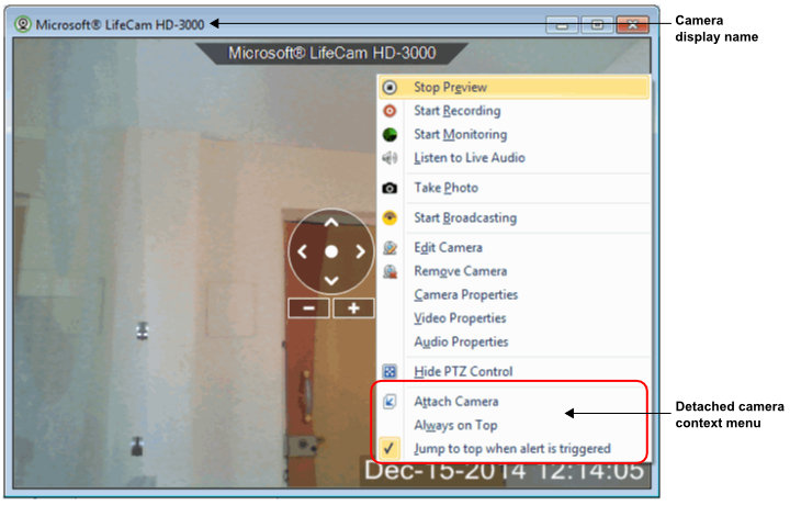 Le titre détaillé de la fenêtre de la caméra montrera le Afficher un nom Sélectionné pour votre Webcam. Cela vous aidera à identifier la Webcam, même si l'application est minimisée ou si l'aperçu de l'appareil photo échoue. Lorsque la Webcam est détachée, les options du menu contextuel suivantes apparaîtront en plus de celles existantes: