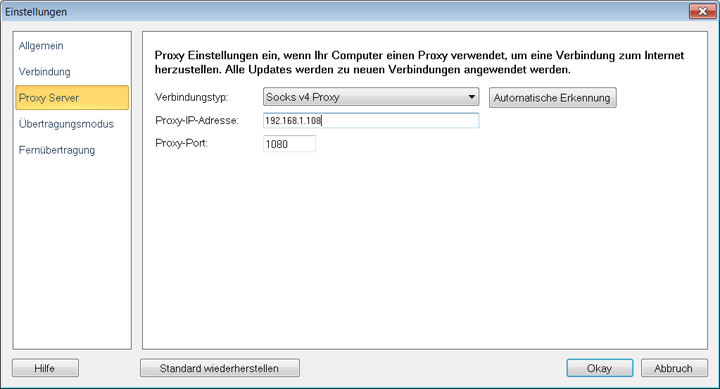 - Proxy-Port: Geben Sie die Proxy-Portnummer ein. Dieses Feld wird automatisch auf den Standardwert gesetzt, abhängig vom ausgewählten Verbindungstyp.