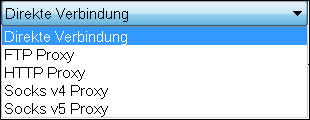 - Verbindungstyp: Der Verbindungstyp definiert, wie eine Verbindung zum FTP-Server hergestellt wird. Standardmäßig, Direkte Verbindung ist ausgewählt. Dies stellt eine direkte Verbindung zu einem FTP-Server ohne Verbindung über einen Proxy her. Folgende Verbindungstypen werden unterstützt: