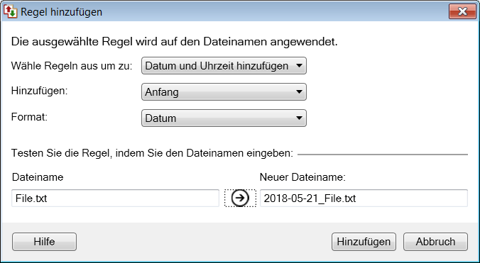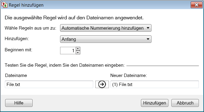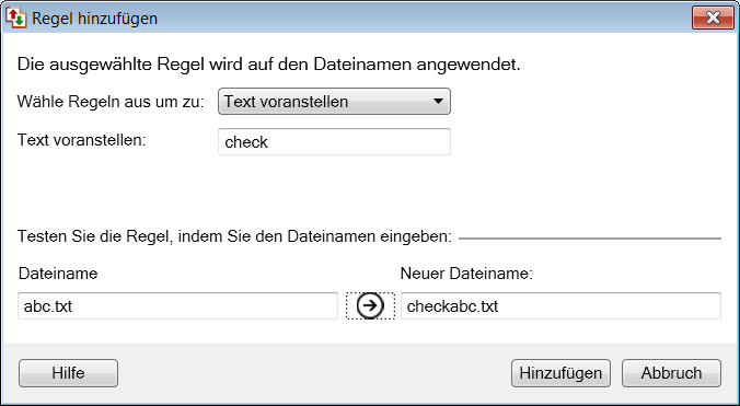 Das Text voranstellen Option ermöglicht es Ihnen, bestimmten Text am Anfang des Dateinamens hinzuzufügen.