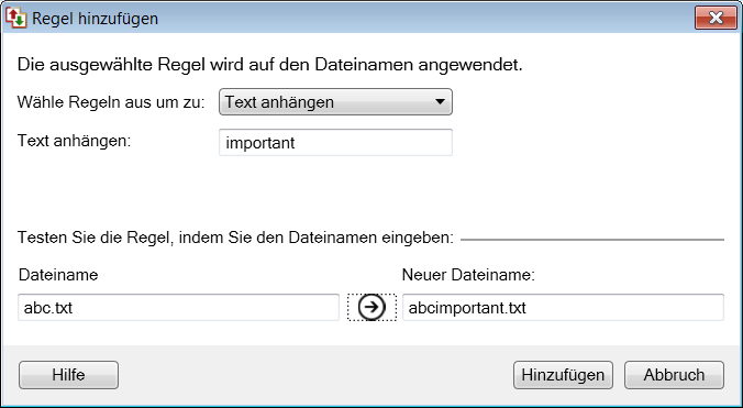Das Text anhängen Option ermöglicht es Ihnen, bestimmten Text am Ende des Dateinamens hinzuzufügen.