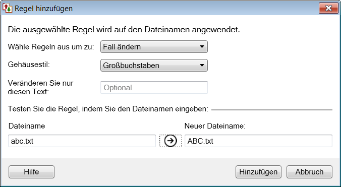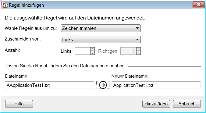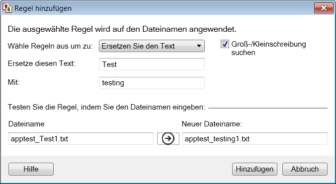 Sie können jede Regel testen, bevor Sie sie zur Liste hinzufügen. Dies ist wichtig, um die ordnungsgemäße Umbenennung von Dateien nach der Übertragung zu bestätigen.
