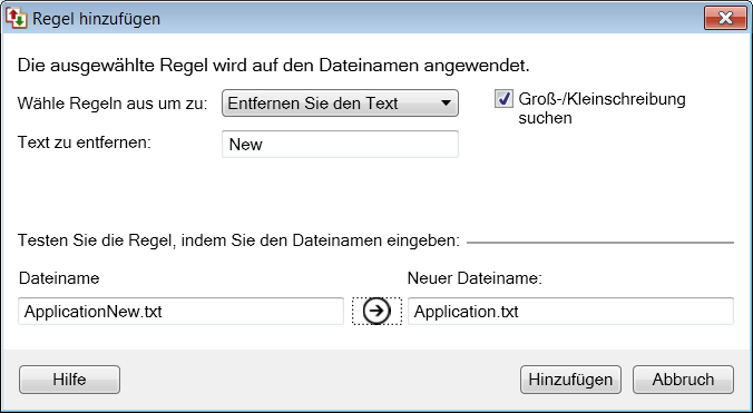Das Entfernen Sie den Text Option ermöglicht es Ihnen, einen Teil des Dateinamens nach der Übertragung zu löschen. Benutze die Groß- und Kleinschreibung Option, um den Dateinamen exakt anzupassen.