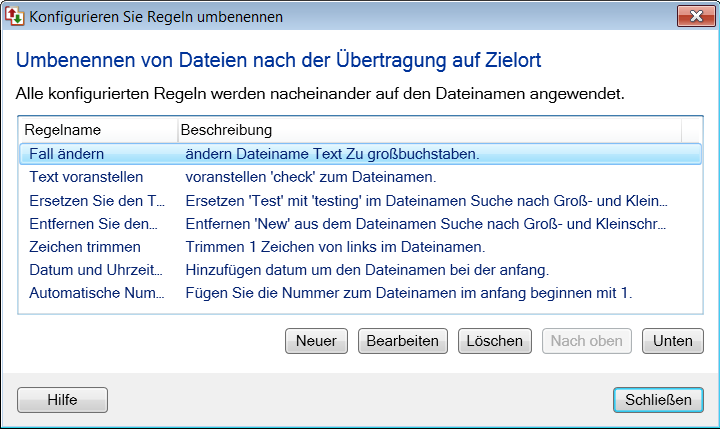Verwenden Sie Regeln zum Umbenennen, um die Dateinamen nach der Übertragung am Zielspeicherort zu ändern. Es gibt 8 Arten von Umbenennungsregeln einschließlich Fall ändern, Text anhängen, Text voranstellen, Ersetzen Sie den Text, Entfernen Sie den Text, Zeichen trimmen, Fügen Sie Datum und Uhrzeit hinzu und Fügen Sie die automatische Nummerierung hinzu.  Die ausgewählten Regeln werden in einer Reihenfolge angewendet, in der sie hinzugefügt werden Konfigurieren Sie Regeln umbenennen Dialog.