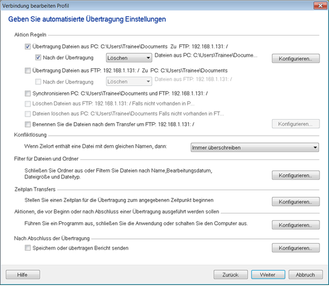 Sobald das automatisierte Profil ausgeführt wurde, können Sie Auto FTP Manager für folgende Operationen festlegen: