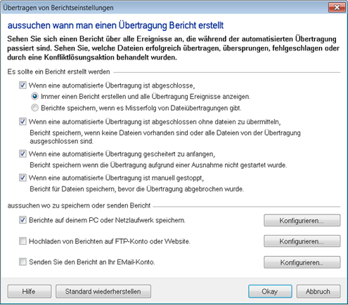 - Transferbericht speichern: Sie können auswählen, wann der Übertragungsbericht generiert werden soll. Sie können einen vollständigen Bericht in Form eines HTML-Dokuments speichern, in dem alle wichtigen Ereignisse zur Übertragung aufgelistet sind. Der Bericht kann auf Ihrem PC, einem Netzlaufwerk oder einem FTP-Server gespeichert werden. Darüber hinaus gibt es eine weitere Option, mit der Sie den Bericht als E-Mail senden können.