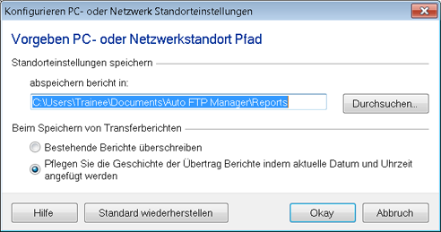PC oder Netzwerklaufwerk Standardmäßig werden die Übertragungsberichte auf Ihrem PC unter Dokumente >> Auto FTP Manager >> Übertragungsberichte gespeichert. Sie können den Standardordner ändern, indem Sie auf klicken Durchsuche.