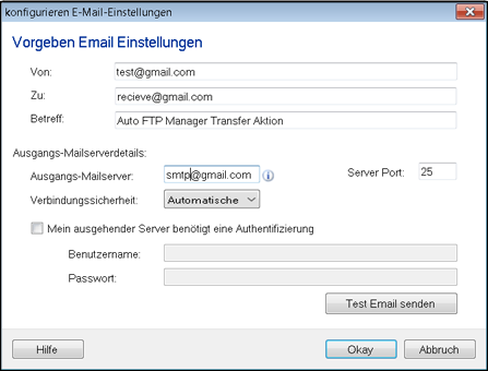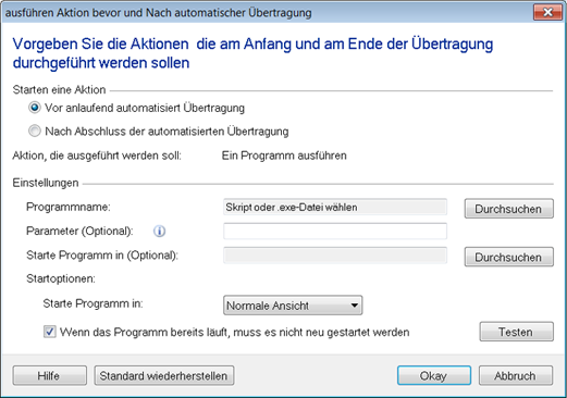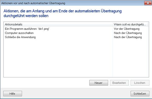 Möglicherweise möchten Sie eine bestimmte Aktion vor oder nach einer Dateiübertragung ausführen. Sie können Aktionen wie das Ausführen eines bestimmten Programms, das Schließen der Anwendung oder das Ausschalten eines Computers konfigurieren.